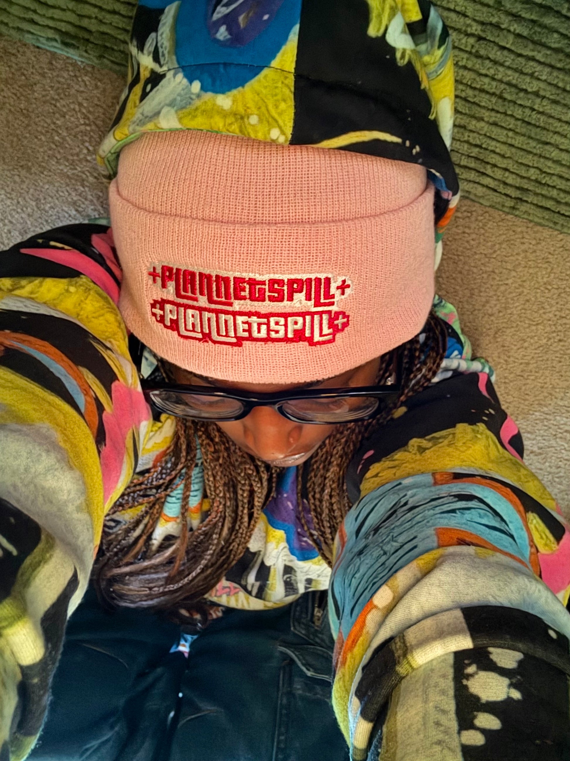 Baby pink beanie with embroidered PLANNETSPILL branding!